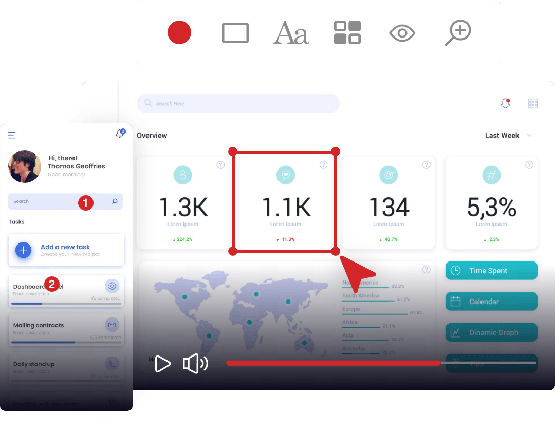 アドオンをクリックするだけでスクリーンショット撮影や画面操作の録画が可能です。さらに、キャンバスツールで画像に注釈を加えられるため、開発チームへバグ発生時の状況を詳細に伝えられます。