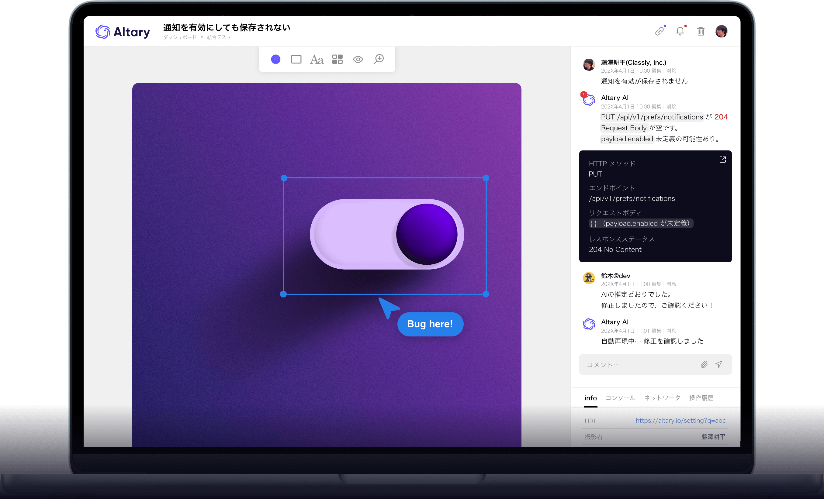 Altary(オルタリー)は、手動テストで見つけたバグの画面・操作・ログを自動収集。