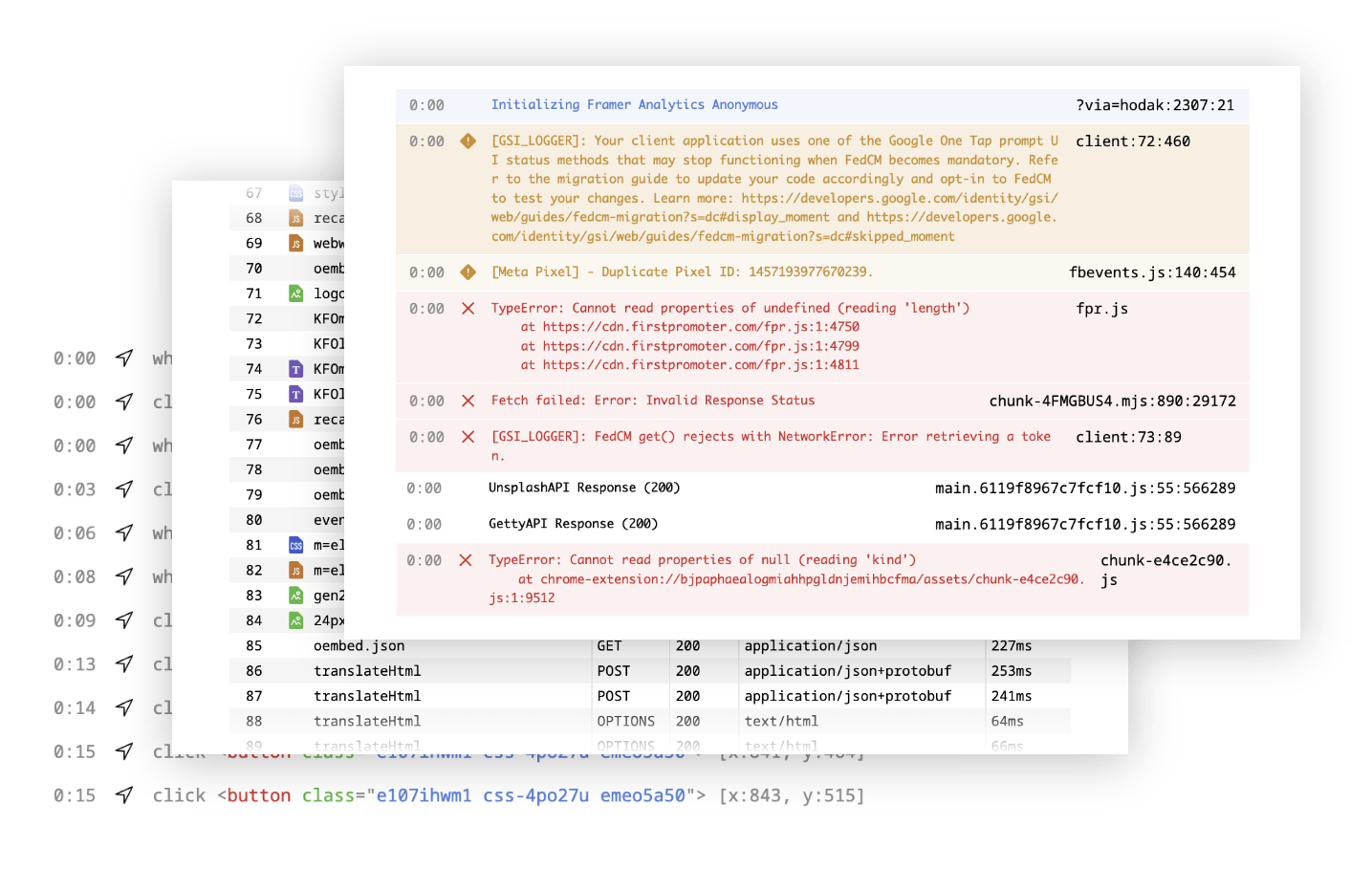- 操作履歴 クリック/スクロールなどの UI 操作をタイムスタンプ付きで追跡し、バグ発生までの再現手順を明確化。